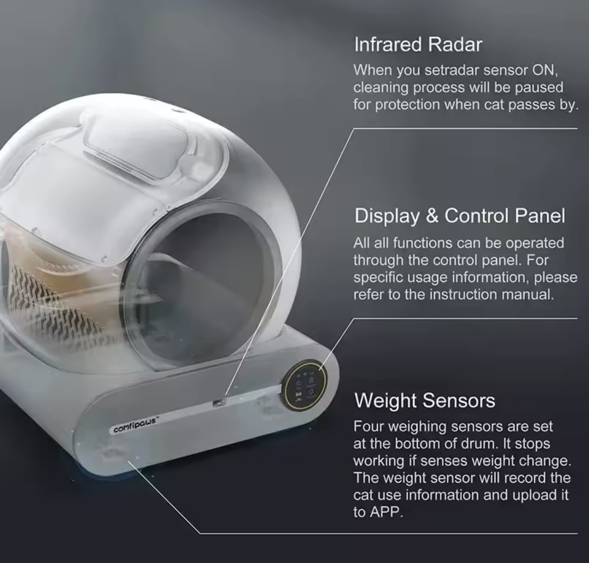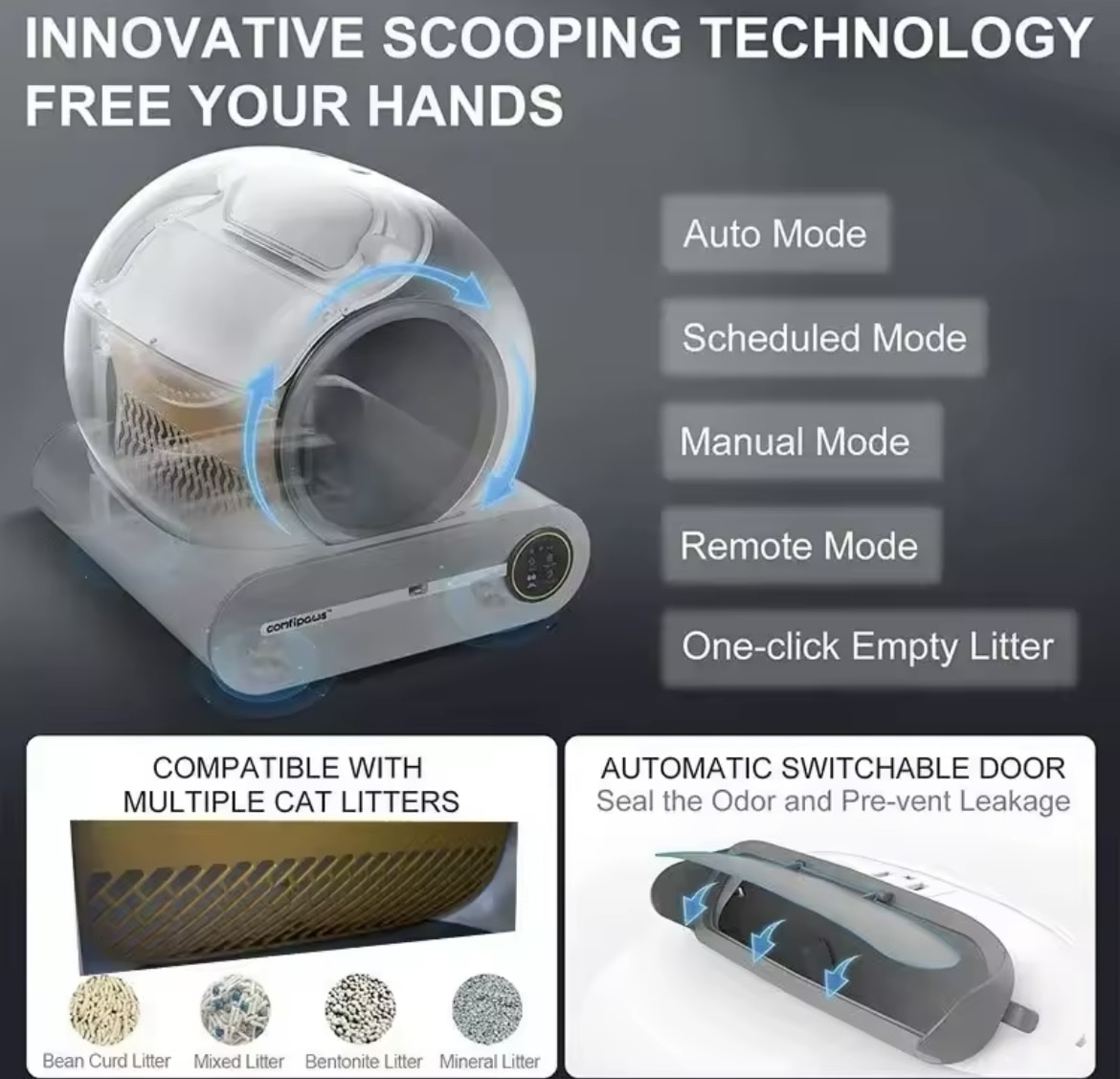 Autonettoyant intelligent : Équipé d’un mécanisme automatique qui nettoie la litière après chaque utilisation, éliminant ainsi les tracas liés au nettoyage manuel.