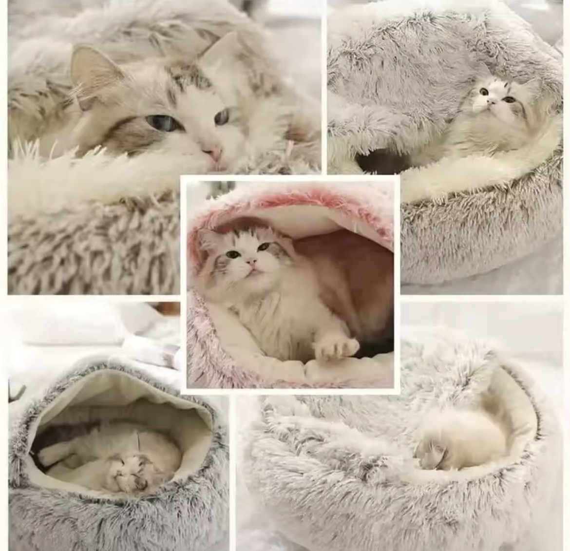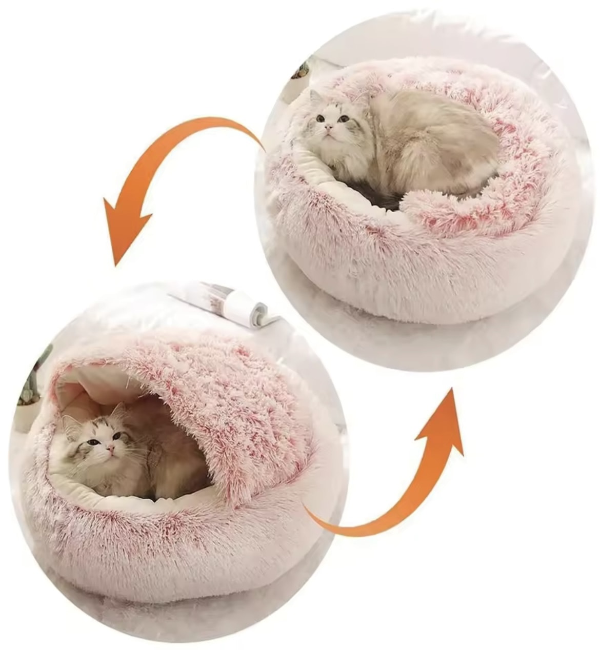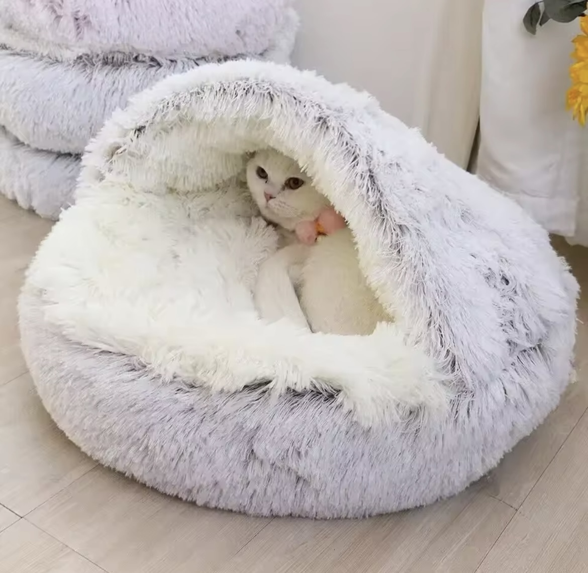 •Design rond et enveloppant : La forme circulaire et la capuche intégrée offrent une sensation de sécurité et un cocon chaleureux où votre animal peut se blottir.